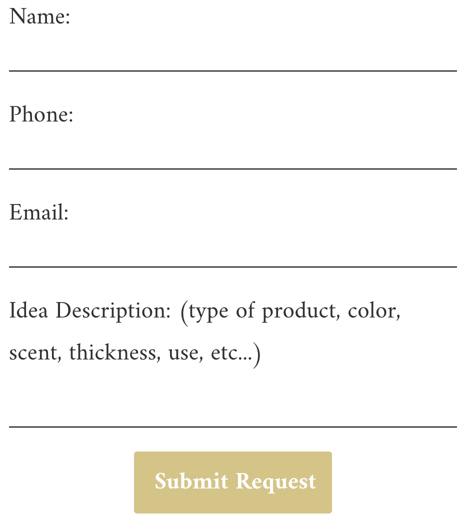 To get started please purchase your consultation & send an email with information regarding your formulation ideas/needs such as: product type, color, thickness, scent, and ingredients. Along with the best time/days to contact you. During your consultation we will discuss next steps and ideas for your personalized products!